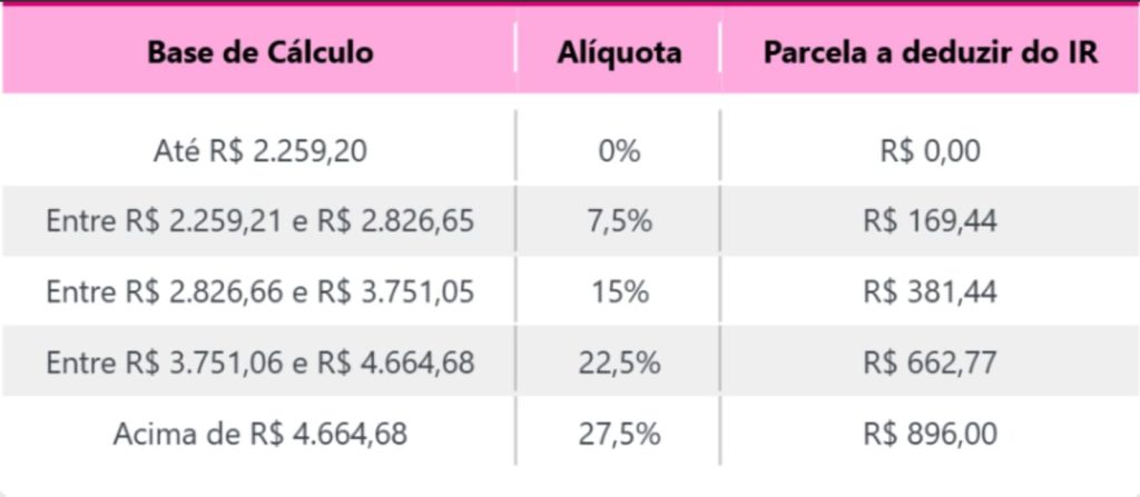 Não houve mudança na Tabela das Faixas Salariais e sua tributação, continua a vigorar da seguinte forma: