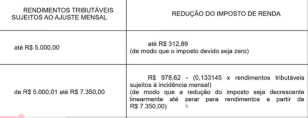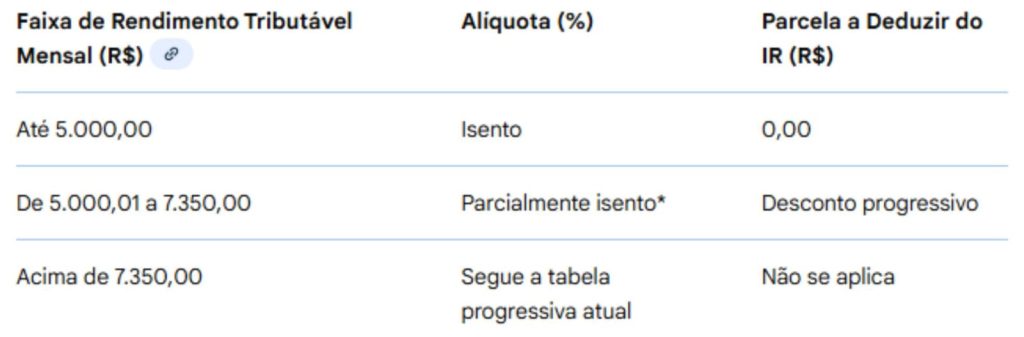 Conforme a Lei 15.270/2025 foi criada uma nova faixão de isenção e uma progressão de desconto.