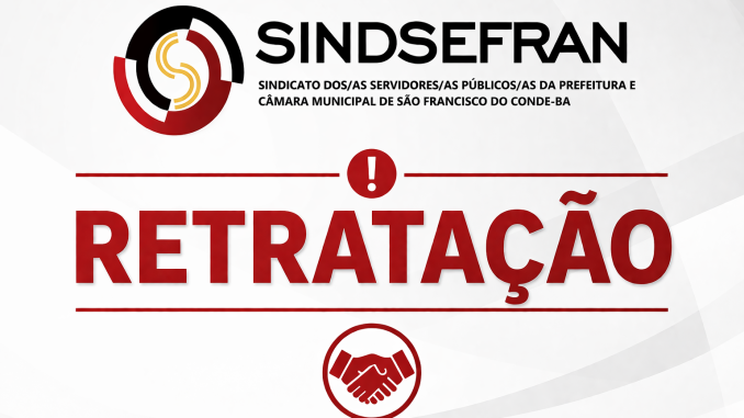 O Sindicato dos Servidores Públicos da Prefeitura e Câmara Municipal de São Francisco do Conde – SINDSEFRAN, no exercício de sua responsabilidade institucional e em cumprimento ao Instrumento de Acordo e Transação celebrado entre as partes, vem a público apresentar formal retratação acerca de fatos anteriormente divulgados envolvendo os advogados Fabiano Souza de Santana e Kátia Alves da Silva.
